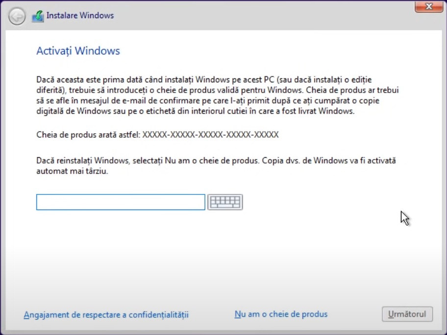 - În continuare, introduceți cheia de produs pentru a valida și activa copia dvs. de Windows. Această cheie este esențială pentru a finaliza instalarea sistemului de operare
