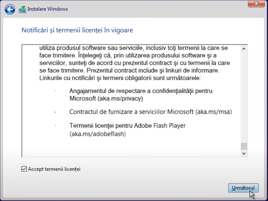 Pentru a continua, trebuie bifata casuta "accept termenii licentei" , dupa care click pe butonul 'Următorul' pentru a proceda cu instalarea.