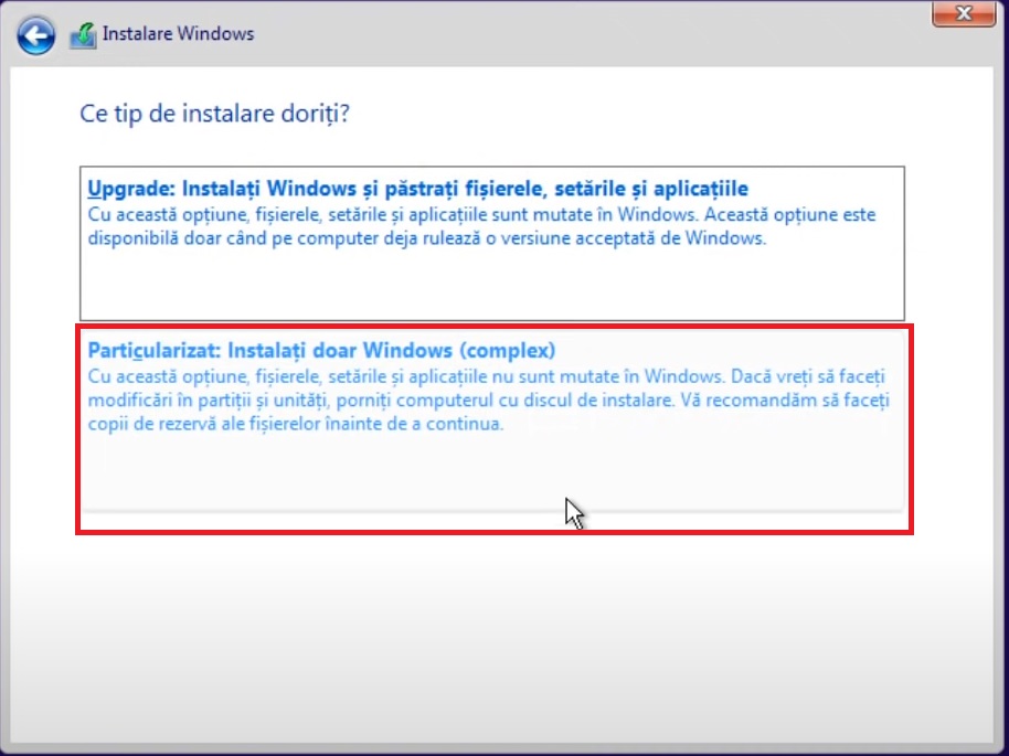 Alegeți 'Particularizat: Instalați doar Windows (Complex)' (opțiunea 2) pentru o instalare nouă și completă a sistemului de operare Windows.